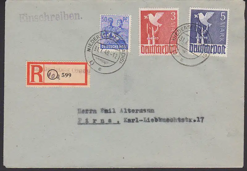 Niedersedlitz R-Brief 31.7.48 mit 3, 5 M Taube als 10-fach-Frankatur portogenau nach Pirna (962 ZF)