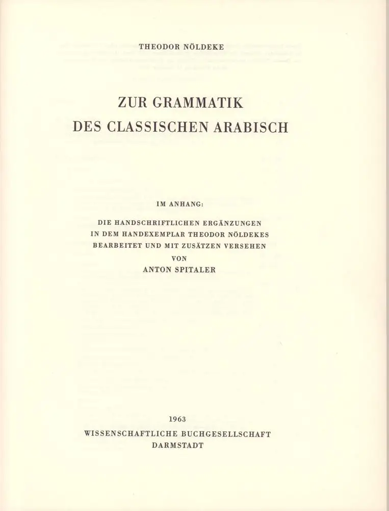 Titel: Zur Grammatik des classischen Arabisch. Im Anhang: Die handschriftlichen Ergänzungen in dem Handexemplar Theodor Nöldekes, bearbeitet u. mit Zusätzen versehen von Anton Spitaler. (Fotomechan. NACHDRUCK der Ausgabe Wien 1897)
