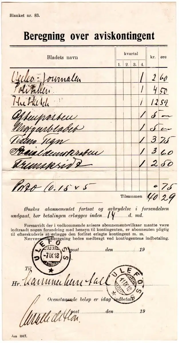 Norwegen 1918, Postschein Beregning over Aviskontingent v. Ulefoss