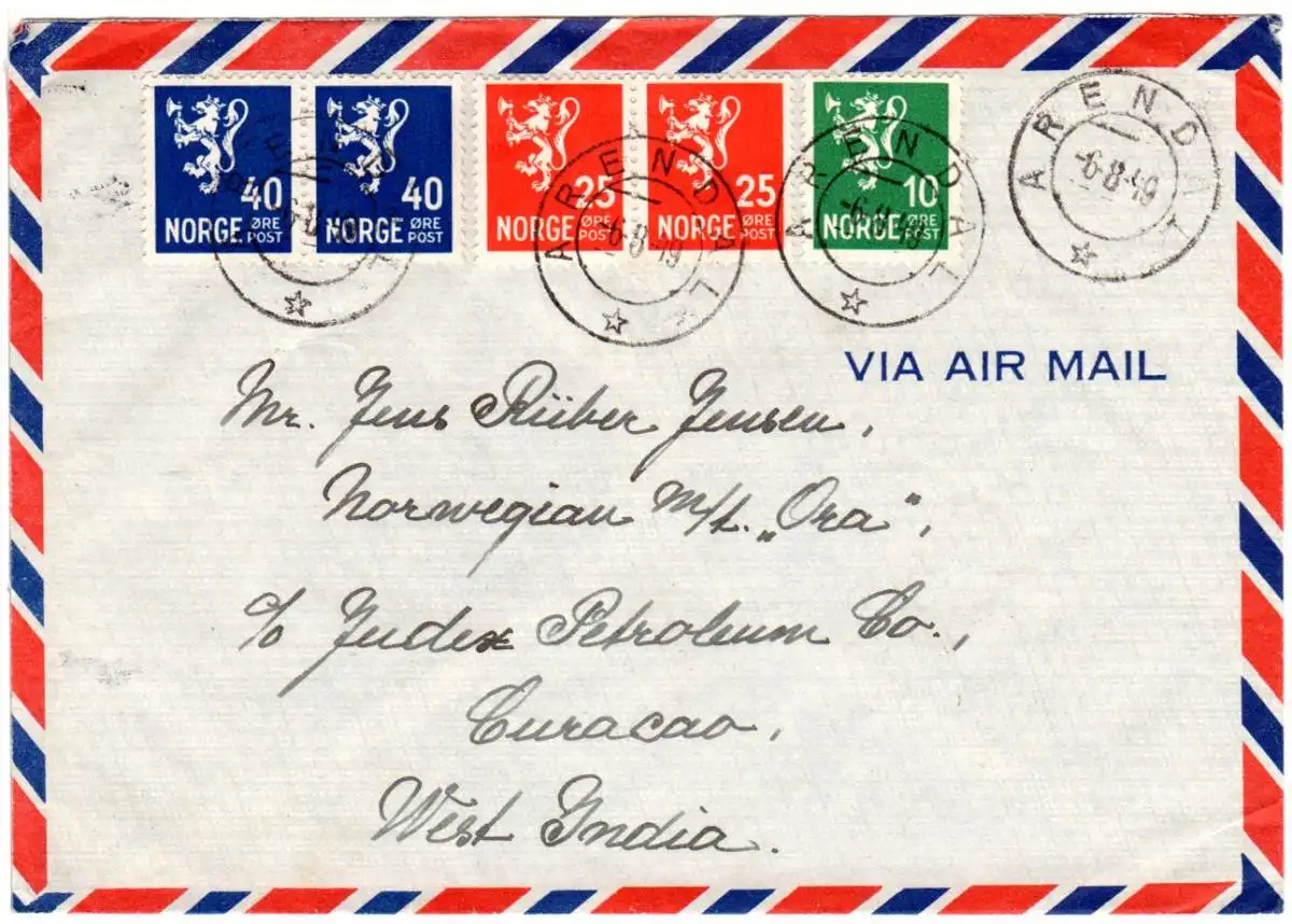 Norwegen 1949, 5 Marken auf Luftpost Brief v. Arendal n. Curacao