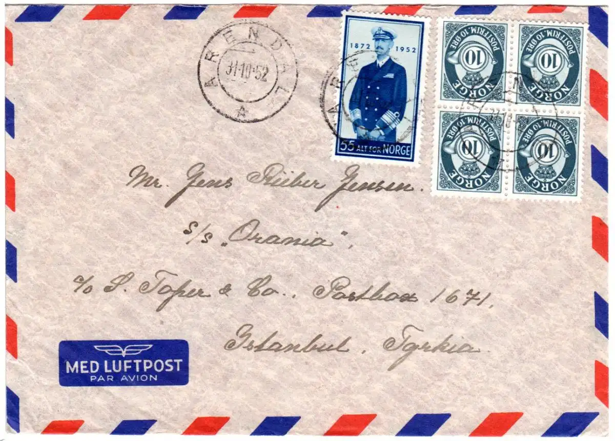 Norwegen 1952, 55+4x10 öre auf Luftpost Brief v. Arendal i.d. Türkei