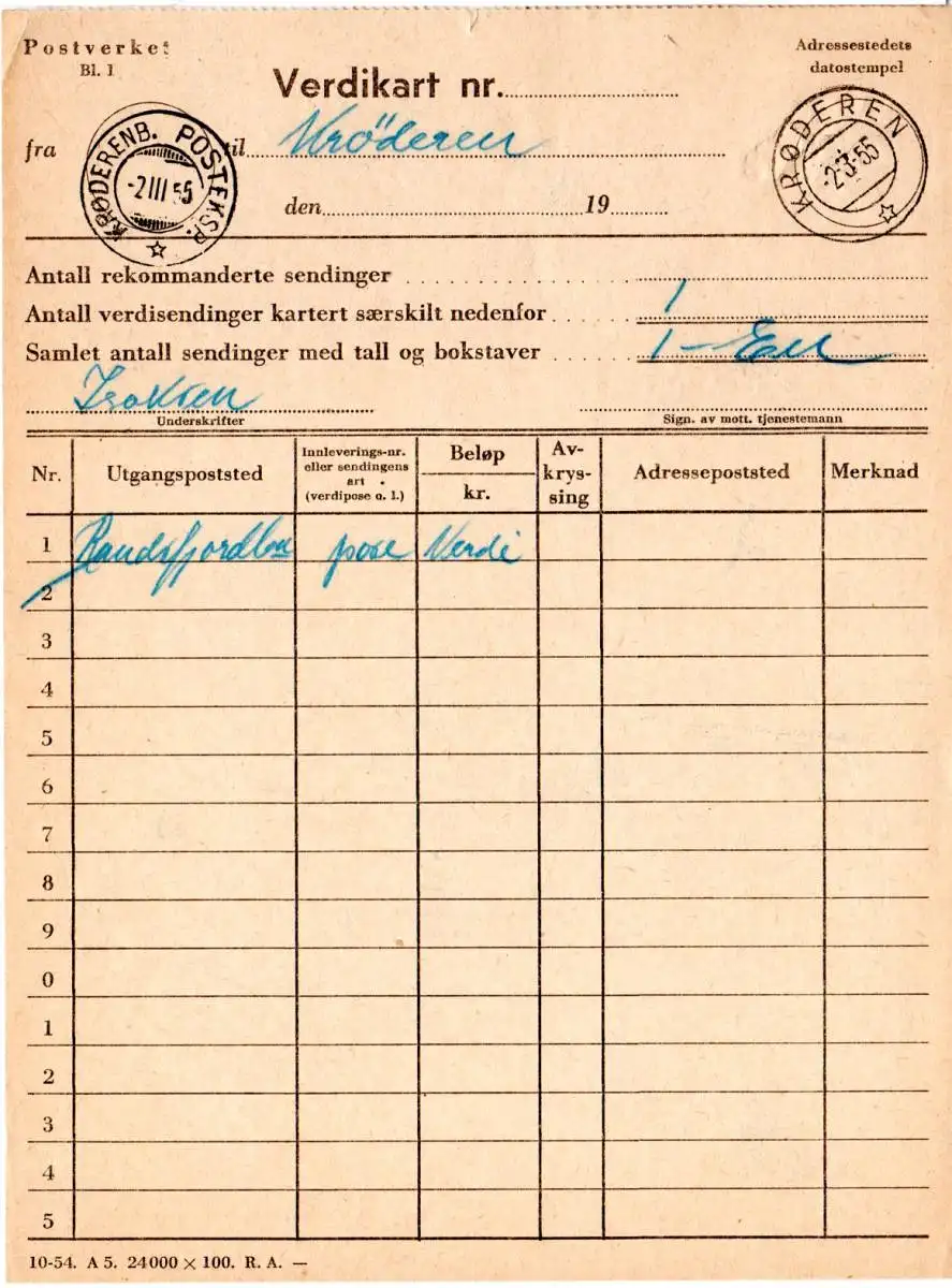 Gut erhaltener Postschein (Bl. 1/2-54. A5.) für 3 Wertsendungen nach Kröderen. Postschein m. waagr. mittiger Faltspur.