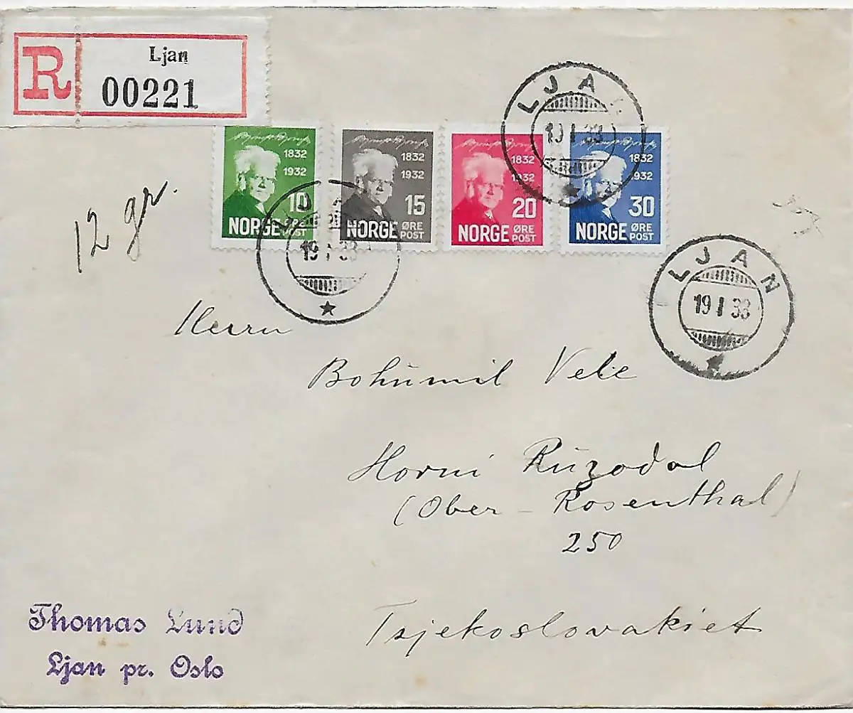 Norwegen: Einschreiben Ljan/Oslo nach Ober-Rosenthal, 1933