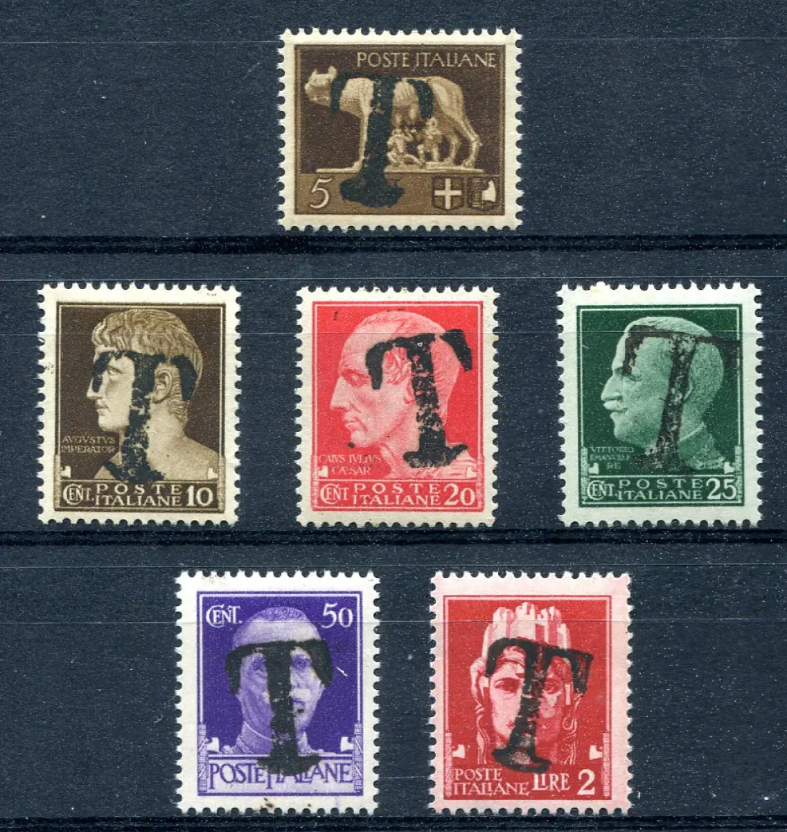 Notfall - Kaiserreich sechs verschiedene handbedruckte Werte T Vollgummi (MNH) - Notfall - Kaiserreich sechs verschiedene niedrige Werte handüberdruckt mit großem T zur Behebung der gravierenden Steuermarkenknappheit (Ministerialversandgenehmigung Nr. 400668 vom 20.1.44) - Ungewöhnlich mit Gummi Code-Nr. 199/2