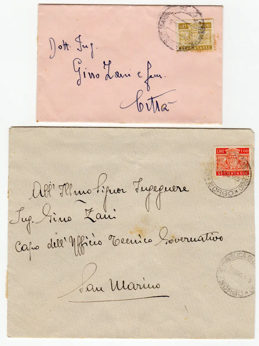 Notfrankaturen - Reisesteuermarken Umschlag - Notfrankaturen - Zwei frankierte Umschläge mit einer gewöhnlich gebrauchten Steuermarkenmarke (Cent. 40 und 1 Lira) - Uncommon Cod. 945/13