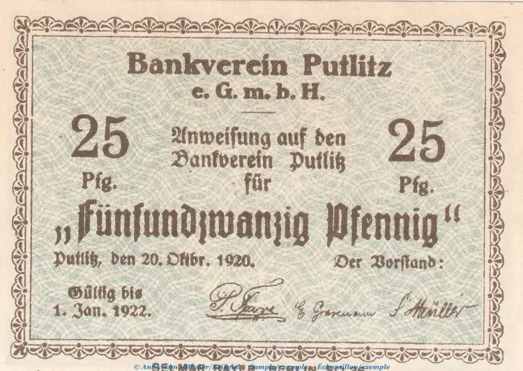 Notgeld Bankverein Putlitz , 25 Pfennig Schein in kfr. Tieste 5815.05.01 von 1920 , Brandenburg Verkehrsausgabe