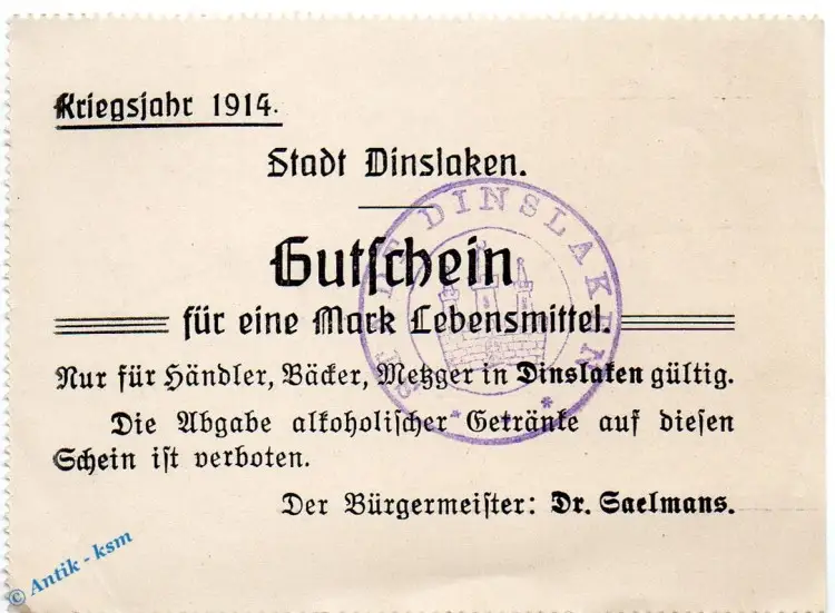 Notgeld der Stadt Dinslaken , Notgeld von 1914/1915Bundesland : Rheinland  ,  Dießner : 83.1.a