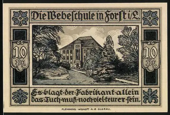 Notgeld Forst, 1921, 10 Pfennig, Die Webeschule und Stadtwappen mit Werkzeugen