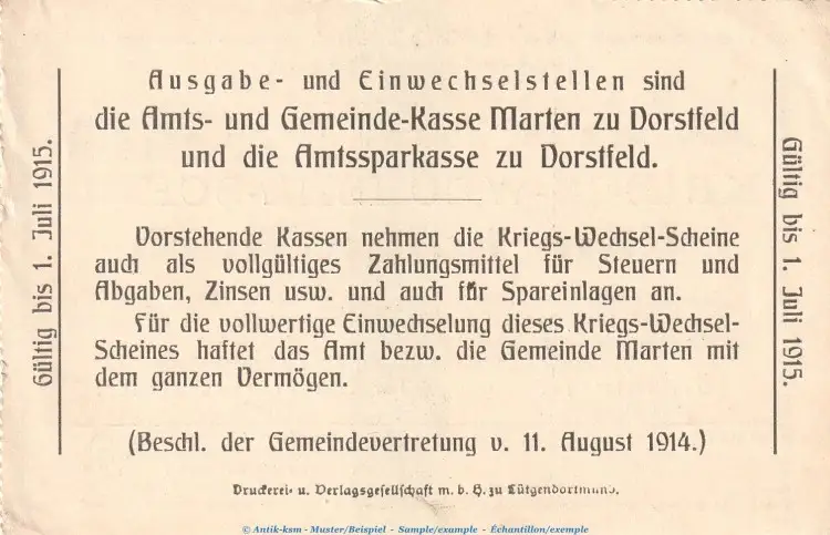 Gutschein / Banknote Amtmann und Gemeindevorsteher Gemeinde Marten , Notgeld 1914/15Bundesland : Westfalen  ,  Dießner : 223.1