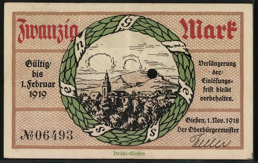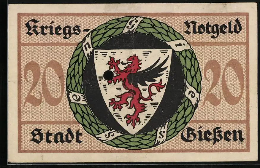 Notgeld Giessen 1918, 20 Mark, Ortsansicht gegen die Hügel, Wappen im Kranz
