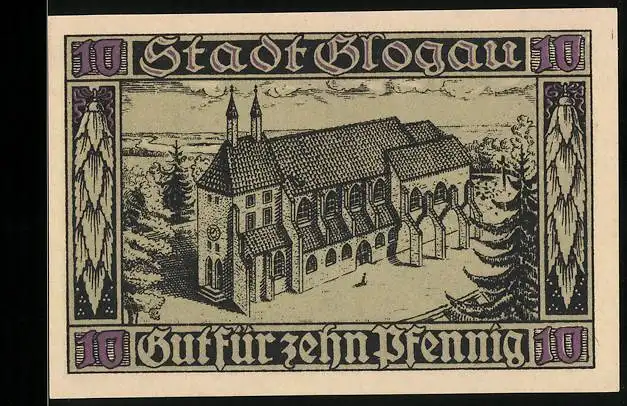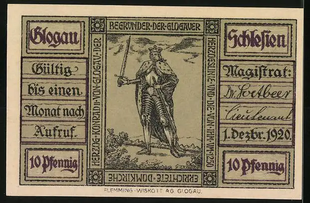 Notgeld Glogau 1920, 10 Pfennig, Kirche und Herzog Konrad mit Schwert, Seriennummer und Wappen
