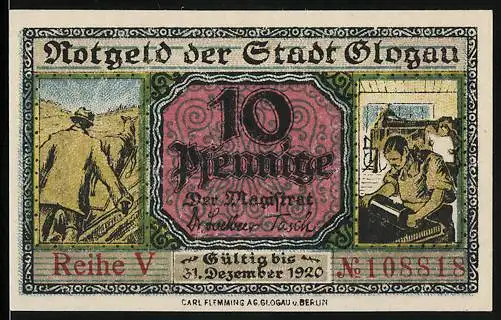 Notgeld Glogau, 1920, 10 Pfennig, Serie V mit Stadtansicht und Arbeiterszenen, gültig bis 31. Dezember 1920