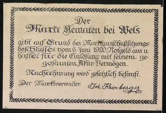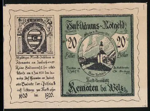 Notgeld Kematen bei Wels 1920, 20 Heller, Jubiläumsdesign mit Kirche und Text, Wappen links