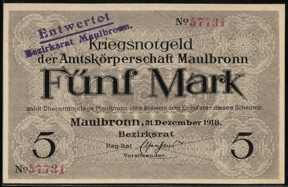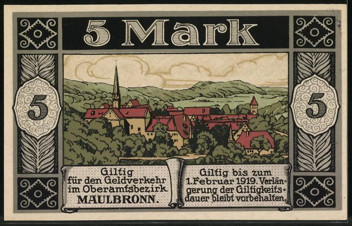 Notgeld Maulbronn 1918, 5 Mark, Ortsansicht mit Landschaftshintergrund, Stempel: Entwertet Bezirksrat Maulbronn