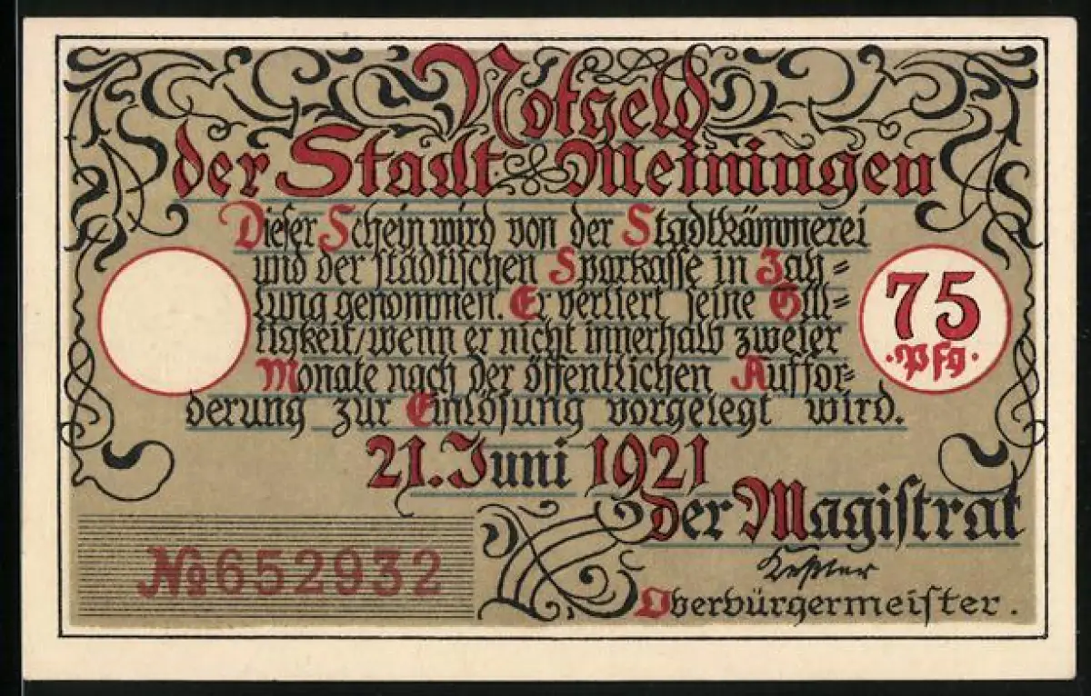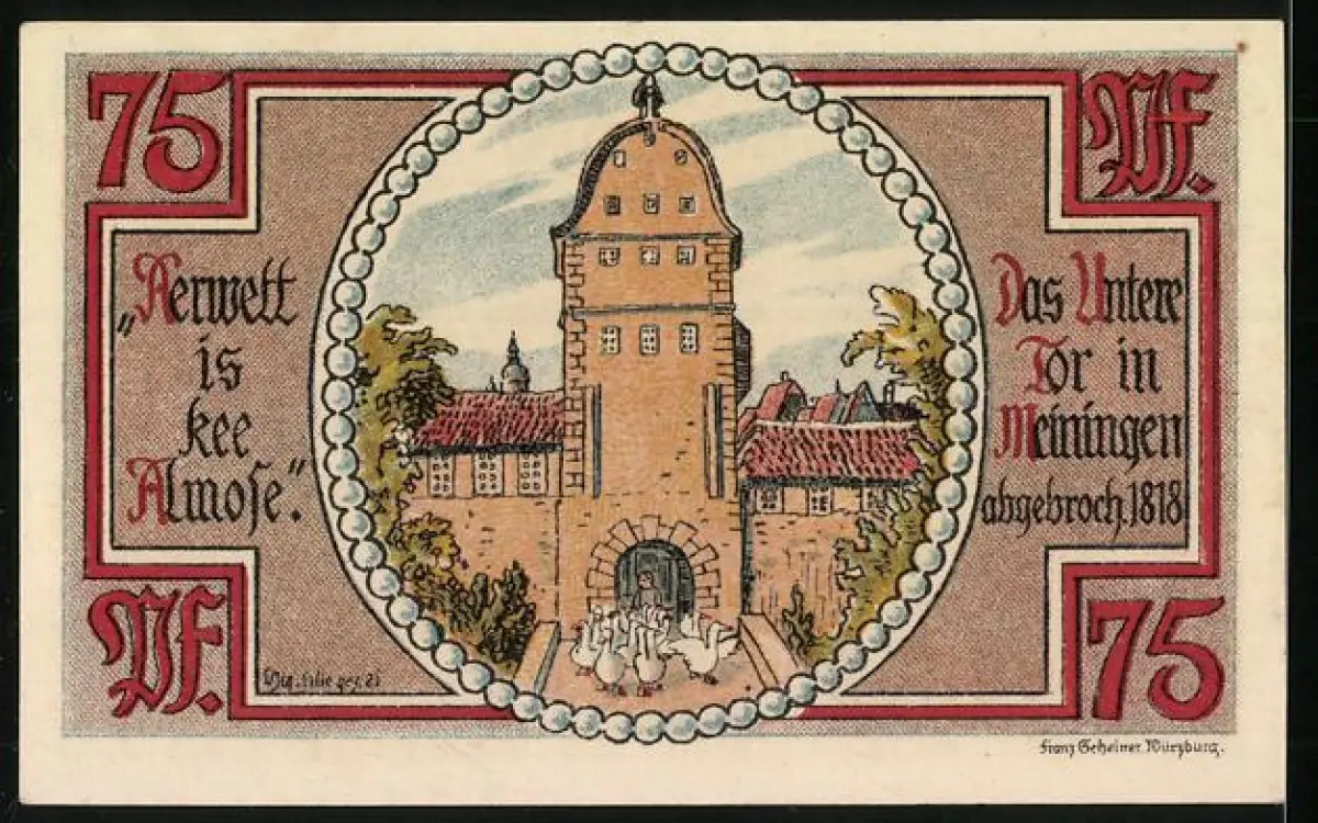 Notgeld Meiningen 1921, 75 Pfennig, Unteres Tor mit Zitat, Seriennummer, Stadtwappenornamentik