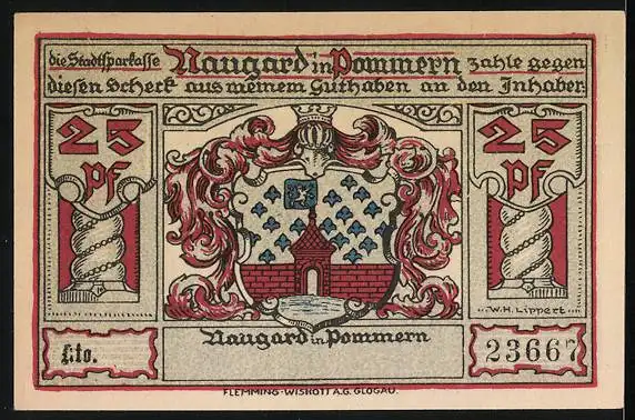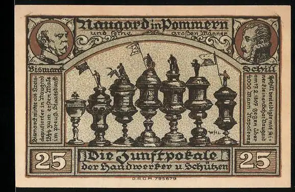 Notgeld Naugard in Pommern, 1921, 25 Pfennig, Kunstpokale der Handwerker und Schützen, Portrait Schill & Bismarck