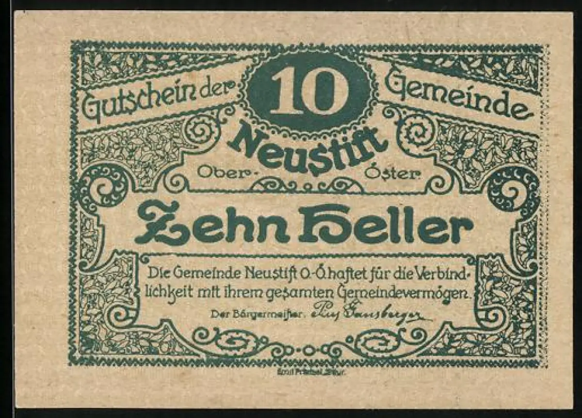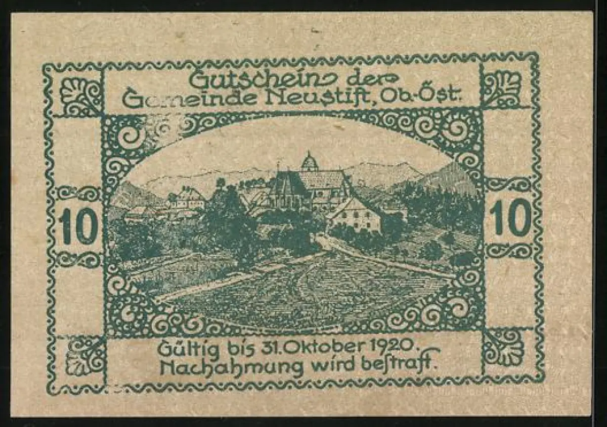 Notgeld Neustift 1920, 10 Heller, Landschaft mit Gebäuden und Bergen im Hintergrund