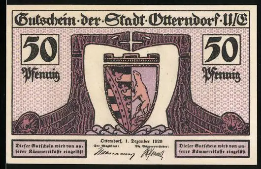 Notgeld Otterndorf u. E. 1920, 50 Pfennig, Wappen, Innenhafen mit Schiffen