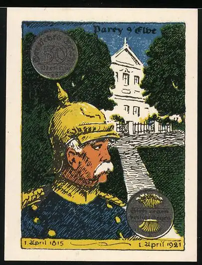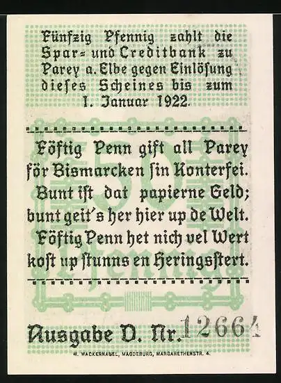 Notgeld Parey an der Elbe 1921, 50 Pfennig, Bismarck und Gebäude im Hintergrund, Text auf Rückseite