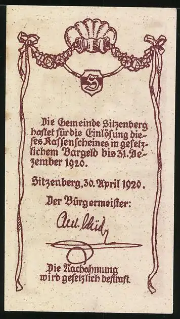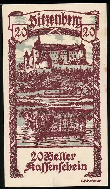 Notgeld Sitzenberg 1920, 20 Heller, Schloss mit Landschaftsmotiv und Siegel
