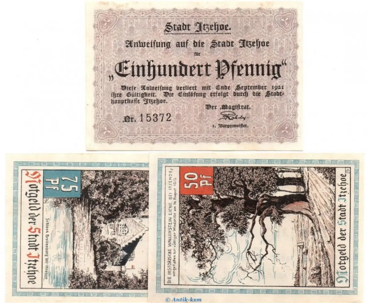 Der Notgeldsatz besteht aus : 50, 75 und 100 Pfennig