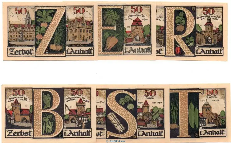 Notgeld Stadt Zerbst 1469.2 , 6 x 50 Pfennig Schein in kfr. von 1921 , Sachsen Anhalt Seriennotgeld