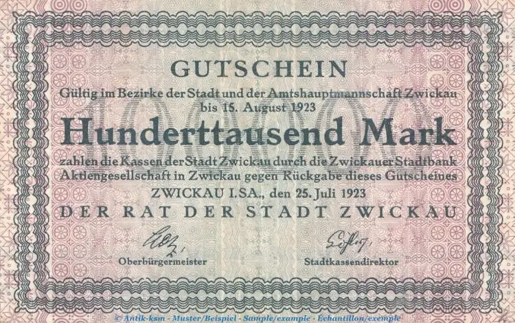 Notgeld Stadt Zwickau , 100.000 Mark Schein in gbr. Keller 5833.a von 1923 , Sachsen Inflation