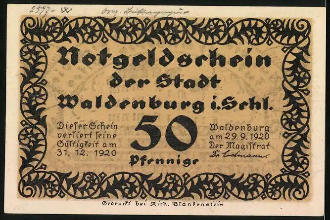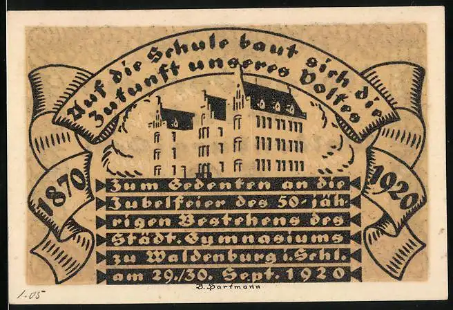 Notgeld Waldenburg 1920, 50 Pfennig, zum 50-jährigen Bestehen des Stadt-Gymnasiums, Gebäude und Inschrift