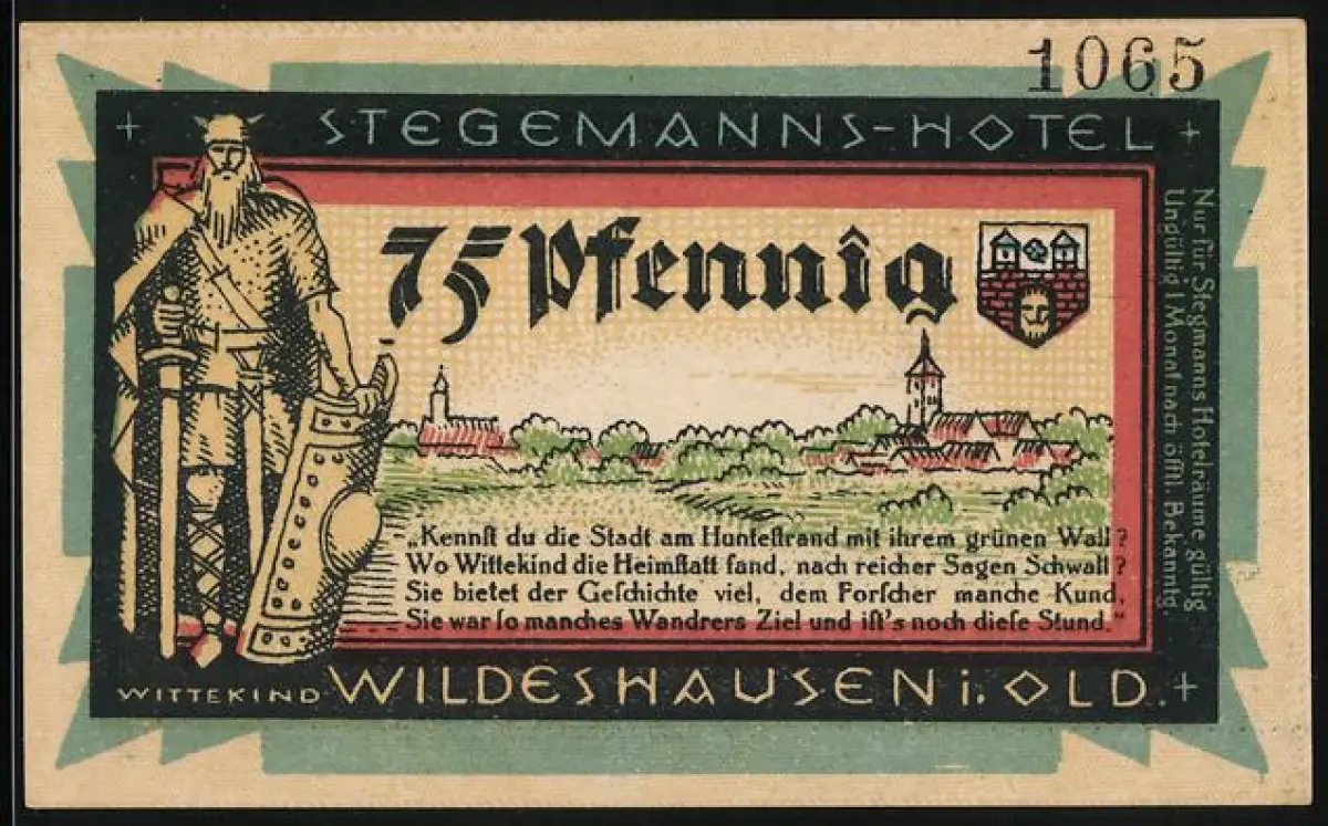 Notgeld Wildeshausen, 75 Pfennig, Stegemanns-Hotel, Krieger mit Stadtansicht und Rathaus in Wildeshausen