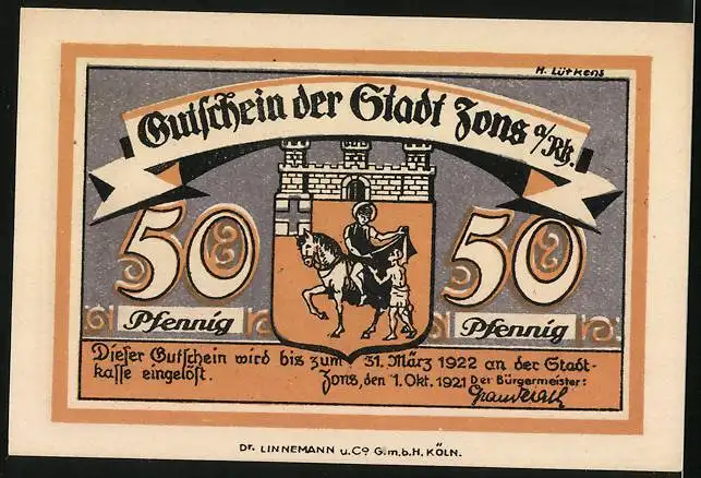 Notgeld Zons / Rhein 1921, 50 Pfennig, Rheinturm und Wappen