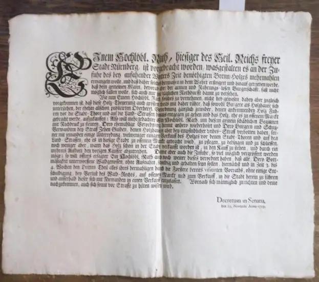Titel: Einem Hochlöbl. Rath, hiesiger des Heil. Reichs freyer Stadt Nürnberg, ist vorgebracht worden, wasgestalten es an der Zufuhr des bey anfahender Winters Zeit benöthigten Brenn-Holzes mehrmahlen ermangeln wolle, und daß daher solches dermassen in dem Wehrt ersteigert und hinauf getrieben werde, daß dem gemeinen Mann, bevorab aber der armen und Nahrungs-losen Burgerschafft, fast nich möglich fallen wolle, sich auch nur zur täglichen Nothdurfft damit zu versehen... Verordnung zur Brennholz-Beschaffung. Decrettum in Senatu, den 19. Novembr Anno 1735