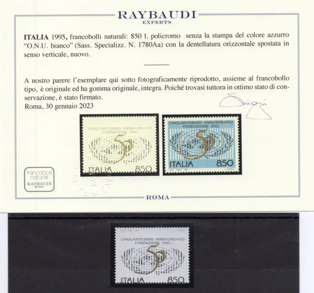 Vollgummi - O.N.U. weiß Lire 850 Nr. 2146 schönes Exemplar b. von f. ohne Aufdruck des blauen Hintergrunds (Sass. spec. Nr. 1780 Eb) - seltene, natürliche Briefmarke mit Raybaudi Zertifikat - Kat. euro 800 n. 653/6