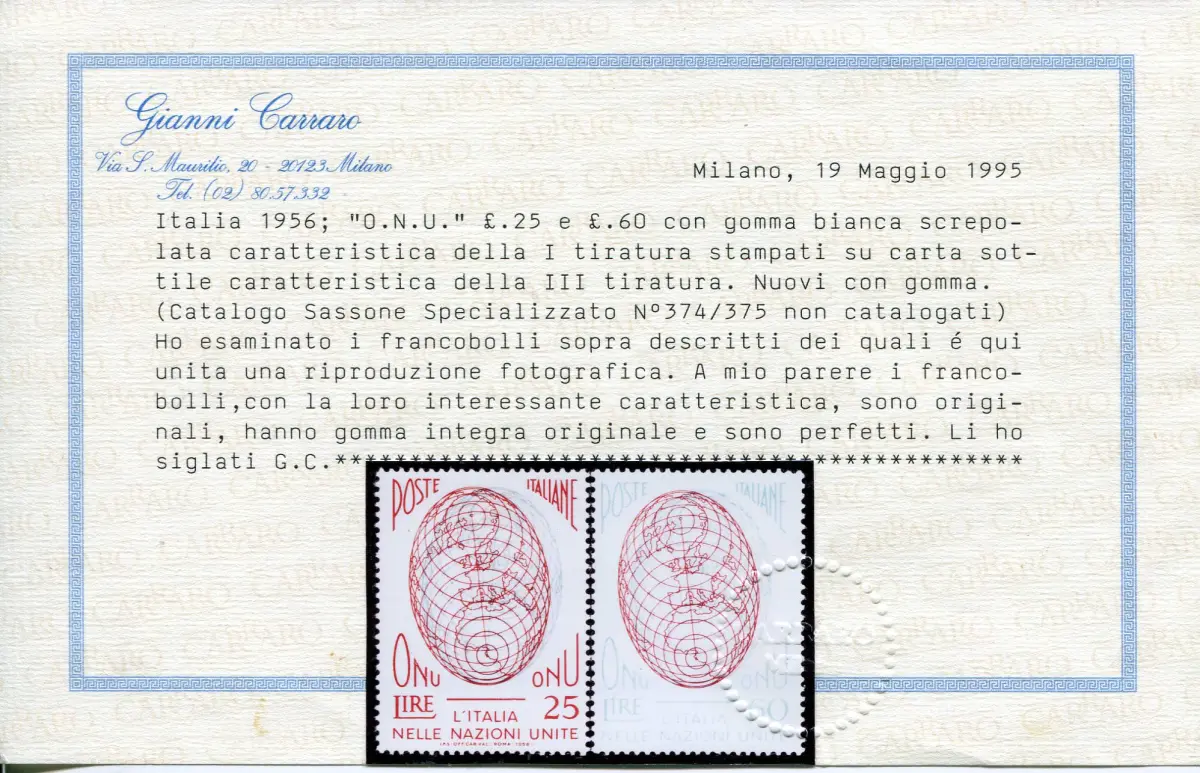 O.N.U. dünne Papiersorte Vollgummi MNH - O.N.U. n. 806/807 zwei Werte auf dünnem Papier gedruckt charakteristisch für die III. Auflage aber mit gerissenem weißem Gummi wie in der I. Auflage - Interessante Variante noch nicht katalogisiert (Sass. spec. eventuell 3. Typ D) - Selten - Zert. G. Carraro Nr. 799/5