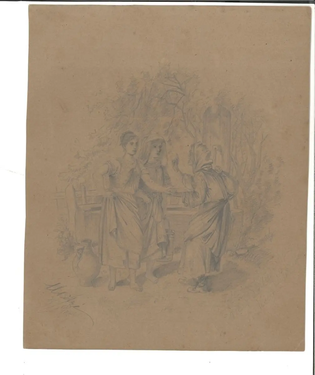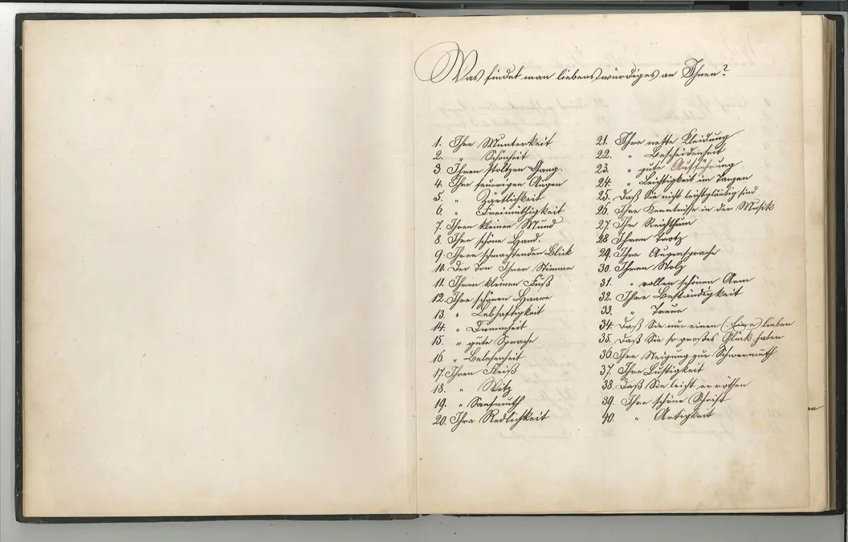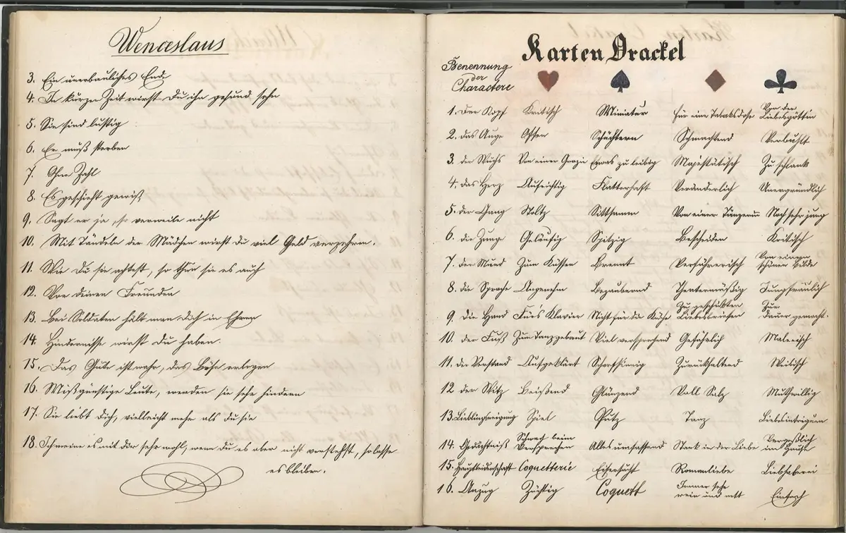 Bemerkungen: Wohl von 2 Händen verfasstes Begleitheft zu einem "Karten Orackel". Die ersten 28 Blätter mit Fragelisten, alphabetischen Namenslisten, 23 Heiligen (u. a. Expedit, Hedvikus, Kilian, Procopius) mit auf Zahlen basierenden Ereignis-Zuschreibungen, "Bennenung der Charactere" für Kreuz, Pik, Herz und Karo. Die Fragelisten betreffen etwa: "Was halten Sie für das größte Glück?", "Welchen Tod werden Sie sterben?", Wo sind Sie mit Ihrem Geliebten bekannt geworden?", Wie werden Sie sich mit Ihrem Geliebten unterhalten?", "Wie muß derjenige beschaffen sein, der Ihnen gefallen soll?" Nach den 28 Blättern folgt ein weißes Blatt und 9 von anderer Hand beschriebene Blätter mit Fragelisten wie "Welches ist Dein Lieblingsdichter?", "Deine Gedanken beim Erwachen", " Wo und wann würde ich gerne gelebt haben" (Mit Antwortmöglichkeiten wie "Wien zur Congresszeit" oder "In Paris im Jahre 1789") oder "Was ist Deinen Lieblingsspeise" (Mit Antwortmöglichkeiten wie "Salzburger Nockerl", "Apfelstrudel" oder " Kaiserschmarrn"). Die beliegende Bleistiftzeichnung auf braunem Papier zeigt "Die Wahrsagerin" von Albert Hendschel, signiert in der linken unteren Ecke " Mitzi, [...] 1887".