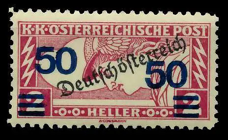 50H auf 2 H Wert aus der Ausgabe - Drucksacheneilmarken von 1916 in Zähnung A (L12 1/2) mit diagonalem Aufdruck "Deutsch Österreich" und Wertüberdruck