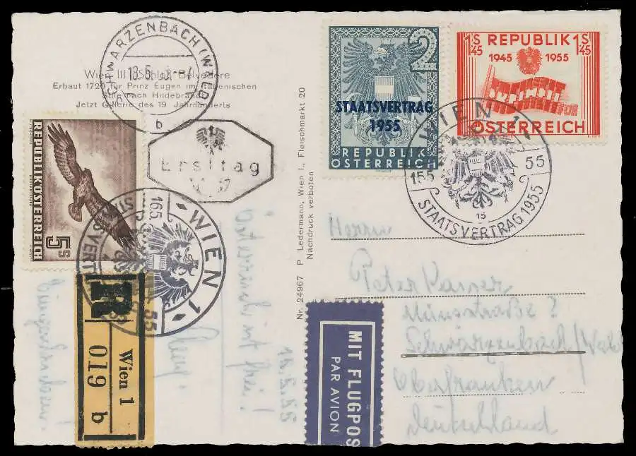 5S Wert aus der Ausgabe Flugpost von 1953 (Vögel), auf Bildpostkarte, Einschreiben, Luftpost von Wien nach Schwarzenbach (D), mit AKS