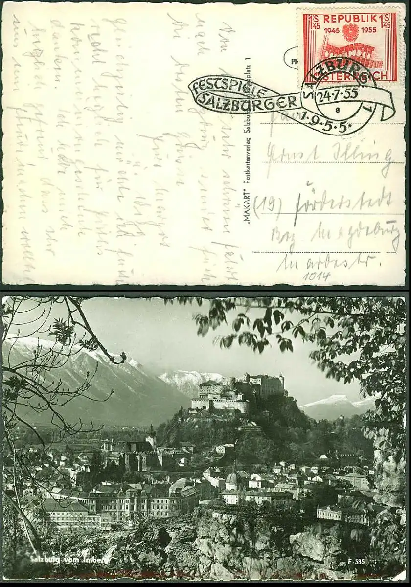 1,45S Wert aus der Ausgabe 10 Jahre Wiederherstellung der Unabhängigkeit der Republik Österreich, auf Ansichtskarte von Salzburg