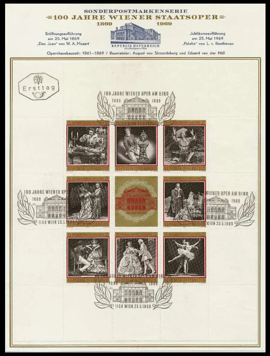 Mittelstück der Block-Ausgabe 100 Jahre Wiener Staatsoper, auf Schmuckkarton (MichelNr.: 1294, 1295, 1296, 1297, 1298, 1299, 1300, 1301)