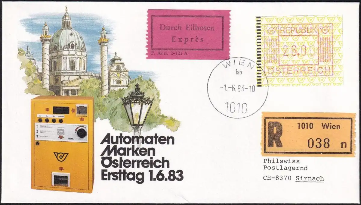ÖSTERREICH 1983 Mi-Nr. ATM 1 Automatenmarken auf Einschreibe/Eilboten-FDC