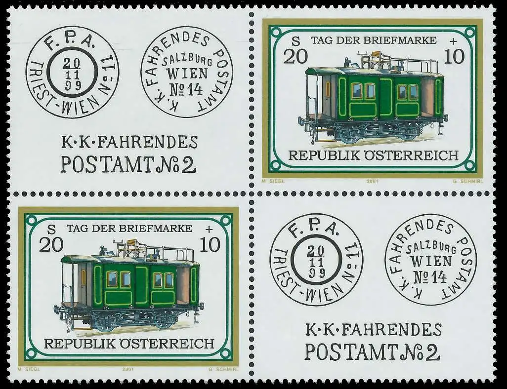 20S + 10S Wert aus der Ausgabe Tag der Briefmarke 2001, Viererblock mit Zierfeld in oben links und unten rechts (MichelNr.: 2345)