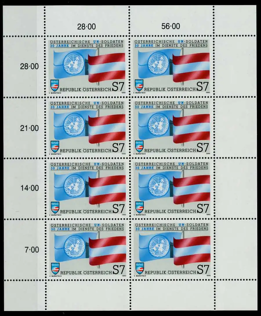 7S Wert aus der Ausgabe 30 Jahre österreichische Soldaten in der UNO Friedenstruppe 1990 im Kleinbogen (ÖS 56 = 4 Euro PP)