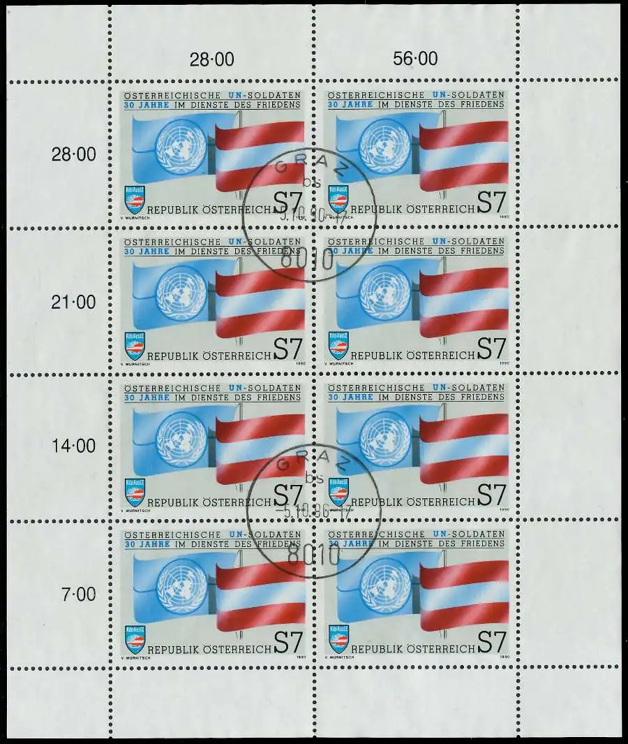 7S Wert aus der Ausgabe 30 Jahre österreichische Soldaten in der UNO Friedenstruppe 1990 im Kleinbogen (ÖS 56 = 4 Euro PP)