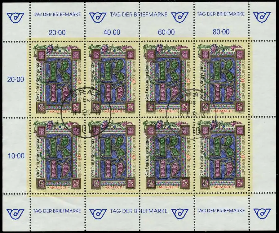 7S + 3S Wert aus der Ausgabe Tag der Briefmarke 1992 im Kleinbogen (ÖS 80 = 6 Euro PP)