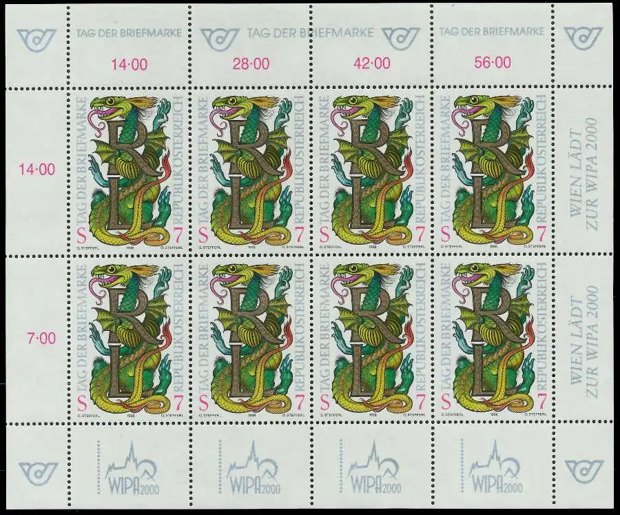 7S Wert aus der Ausgabe Tag der Briefmarke 1998 im Kleinbogen (ÖS 56 = 4 Euro PP)