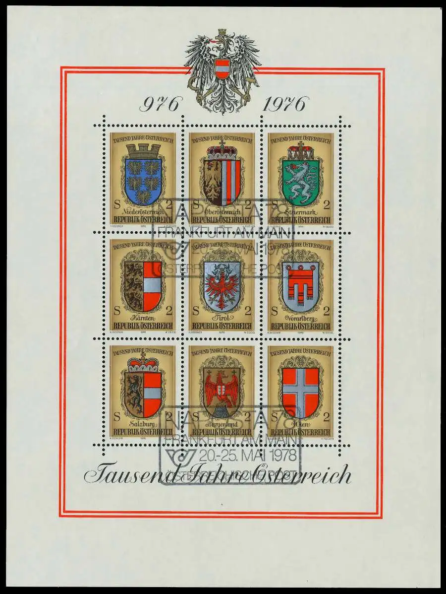 Block-Ausgabe 1000 Jahre Österreich, Bundesländer, Wappen, mit Messestempel NAPOSTA Frankfurt, die Stempel können auch anders liegen, als wie am Beispielbild angezeigt. (MichelNr.: 1522, 1523, 1524, 1525, 1526, 1527, 1528, 1529, 1530)