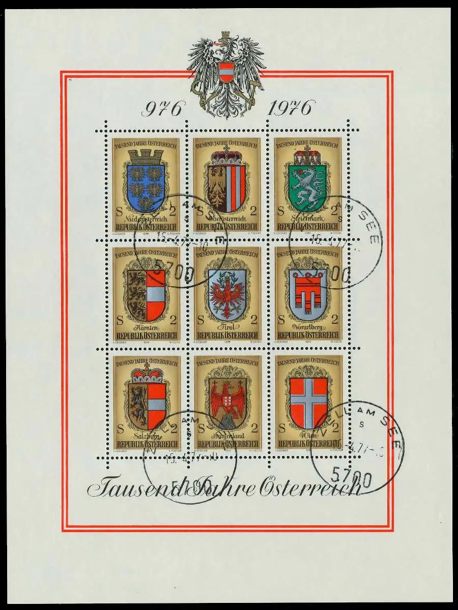 Block-Ausgabe 1000 Jahre Österreich, Bundesländer, Wappen, mit Tagesstempel Zell am See, die Stempel können auch anders liegen, als wie am Beispielbild angezeigt. (MichelNr.: 1522, 1523, 1524, 1525, 1526, 1527, 1528, 1529, 1530)