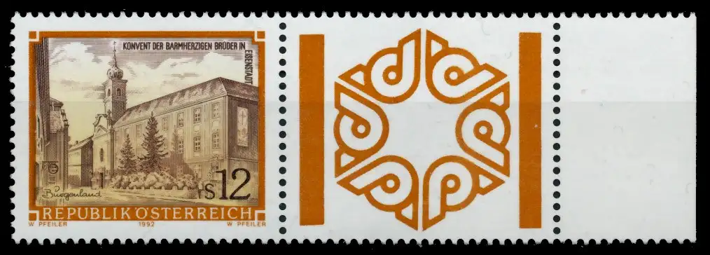 12S Wert aus der Freimarken-Ausgabe Stifte und Klöster - Eisenstadt, mit anhängendem Zierfeld rechts (MichelNr.: 2071)