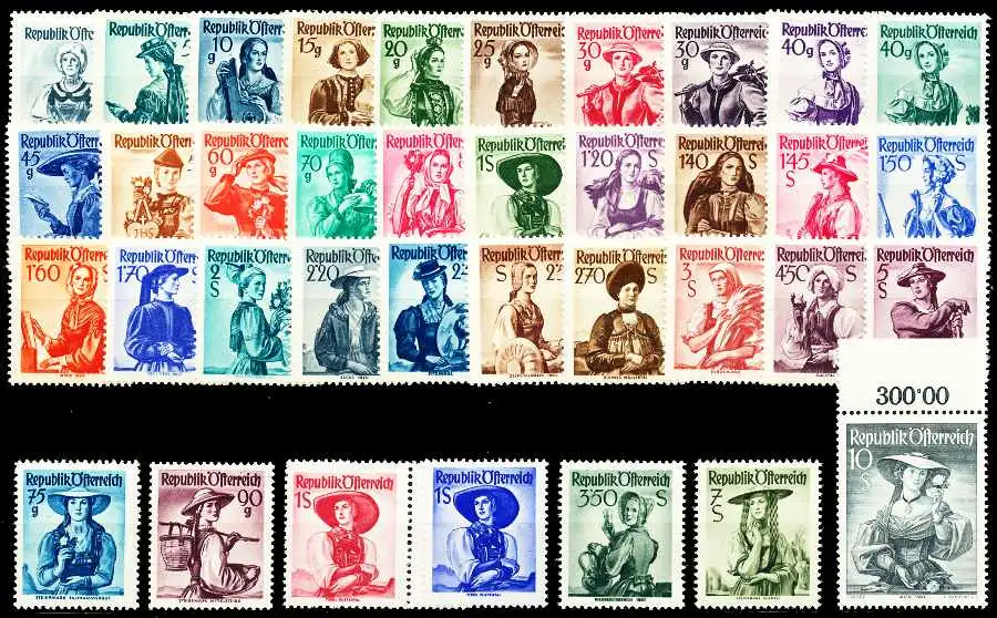 Ausgabe Trachtenserie von 1948-1956, grau/gelbes Papier (37 Werte)