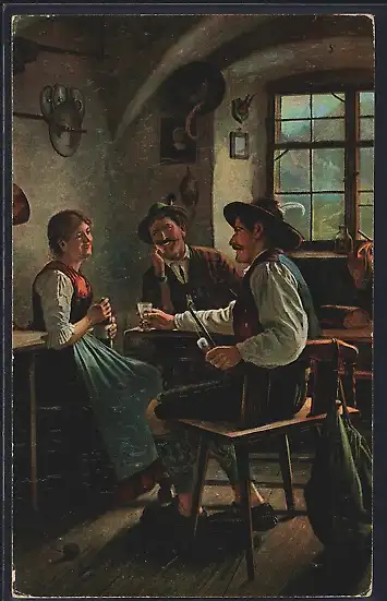 Ölgemälde-Imitations-AK Imita / A.S.-M. Leipzig Nr. 9619: Zwei Männer mit Wirtin im Gasthaus