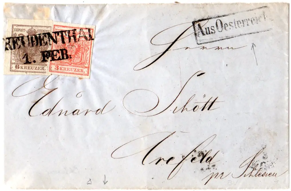 Breifteil (rücks. Briefklappen teils fehlend, siehe scans) m. 3+6 Kr. u. klarem Schlesien-Stpl. Freudenthal sowie R1 Aus Oesterreich. Urprünglich nach Crefeld, Preussen gelaufener Brief (Ank.Stpl. rückseitig).